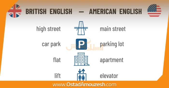 ۱. حملونقل: Lift (BrE) vs elevator (AmE)، boot (BrE) vs trunk (AmE)، petrol vs gas. مثال: در سفر به لندن، گفتن "fill up the gas" گیجکننده است!